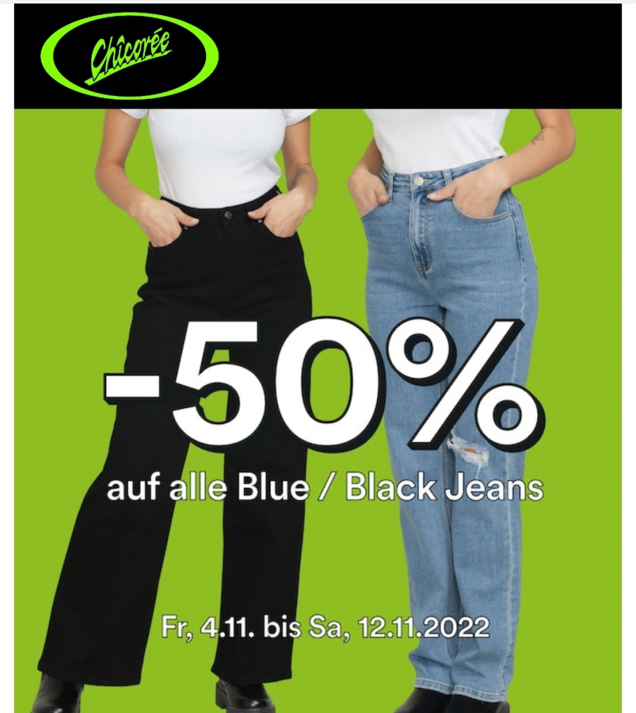 Erhalte -50% Rabatt auf alle Blue & Black Jeans in allen Chicorée Filialen.