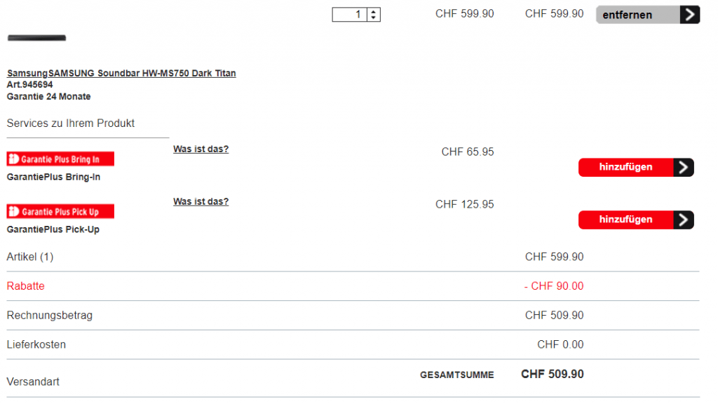 Bei Interdiscount gibt es aktuell die Samsung Soundbar HW-MS750 für 509.90 inkl. Lieferung, wenn man im Warenkorb den Gutschein „15-55-TV“ eingibt. Die Soundbar kostet bei anderen Schweizer Händlern bereits ohne den Interdiscount-Rabattcode deutlich mehr, also ein absolute Schnäppchen!