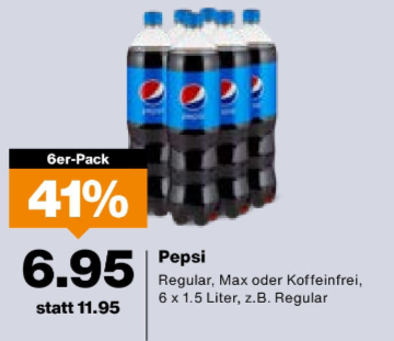 So könnt ihr euch wieder das Sixpack an 1.5l-Flaschen für 6.95 Franken sichern. Dabei könnt ihr zwischen Regular, Max und Max Koffeinfrei auswählen. Leider scheint es ansonsten keine Rabatte auf andere Produkte der Pepsico zu geben.