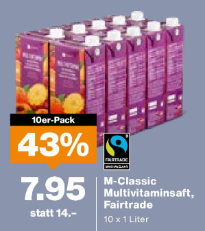 Ebenfalls in Aktion ist das 10er-Pack Multivitaminsaft aus Max Havelaar Fairtrade-Quellen. Dieses gibt’s für 7.95 Franken!