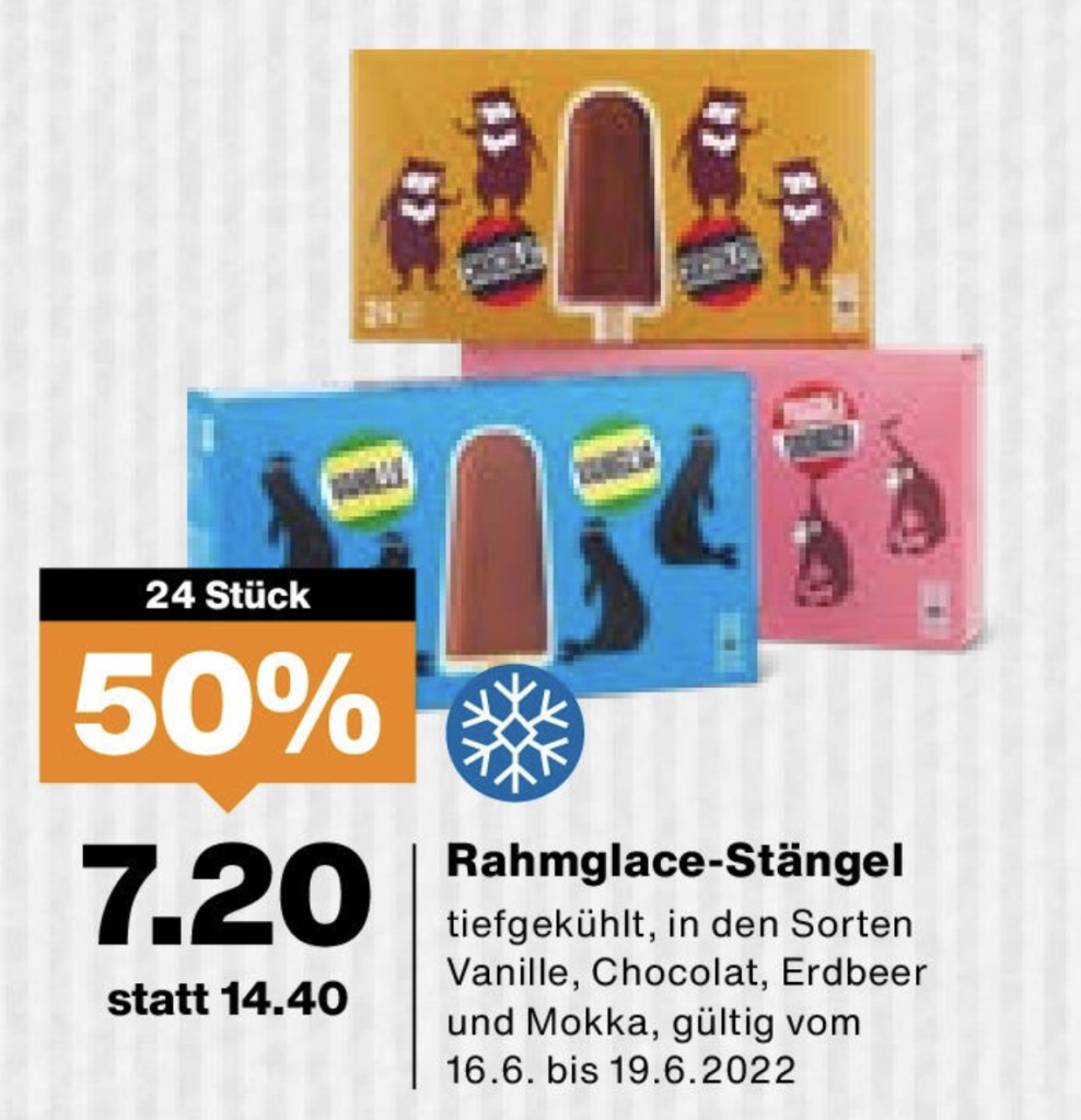 Bei Migros gibt’s im Wochenendknaller noch bis zum 19.6. 24 Stück der kultigen Rahmglacé-Stängel für 7.20 Franken! Den Deal gibt’s immer wieder, ich habe aber noch nie gesehen, dass es das Glacé je günstiger gegeben haben soll.