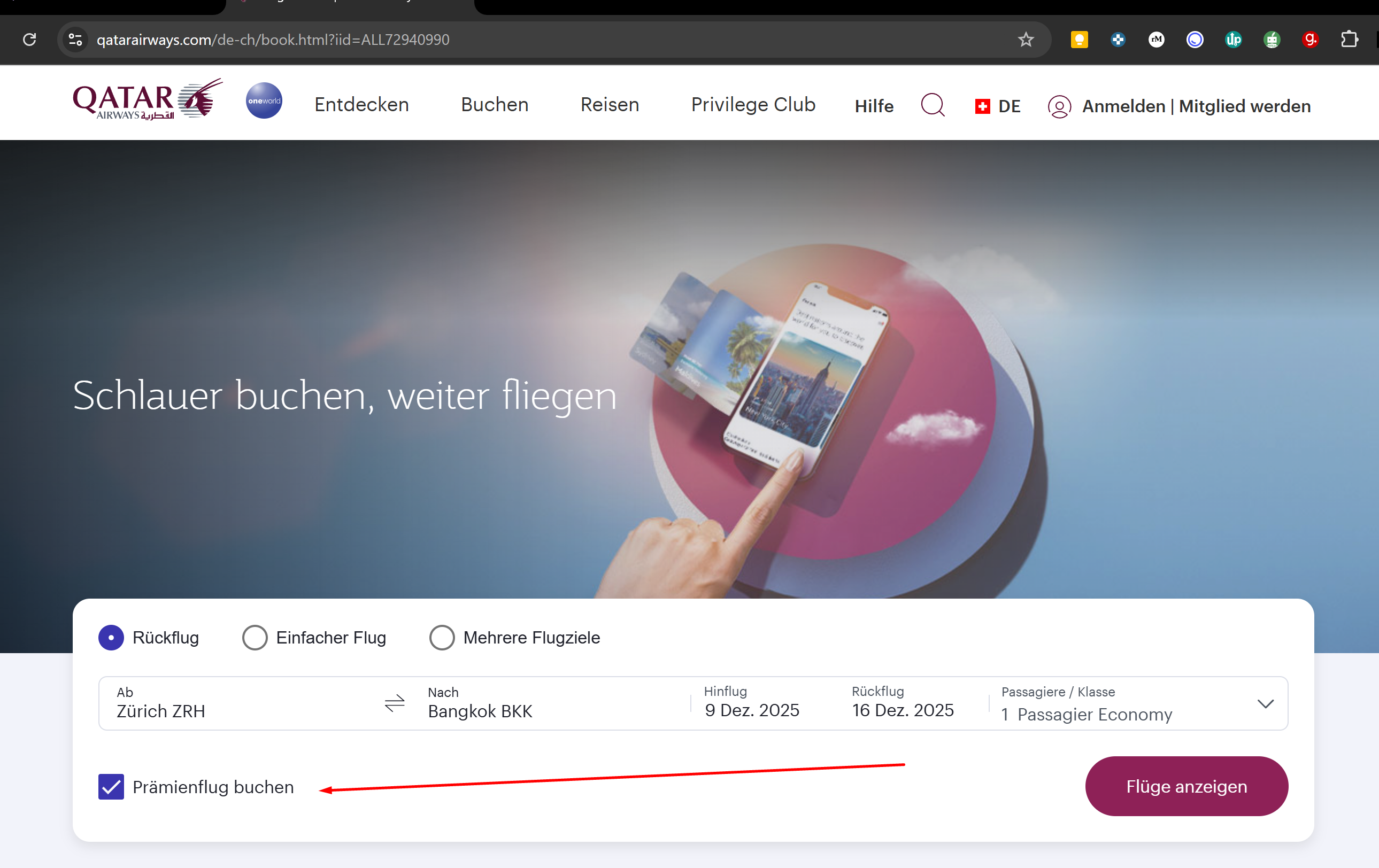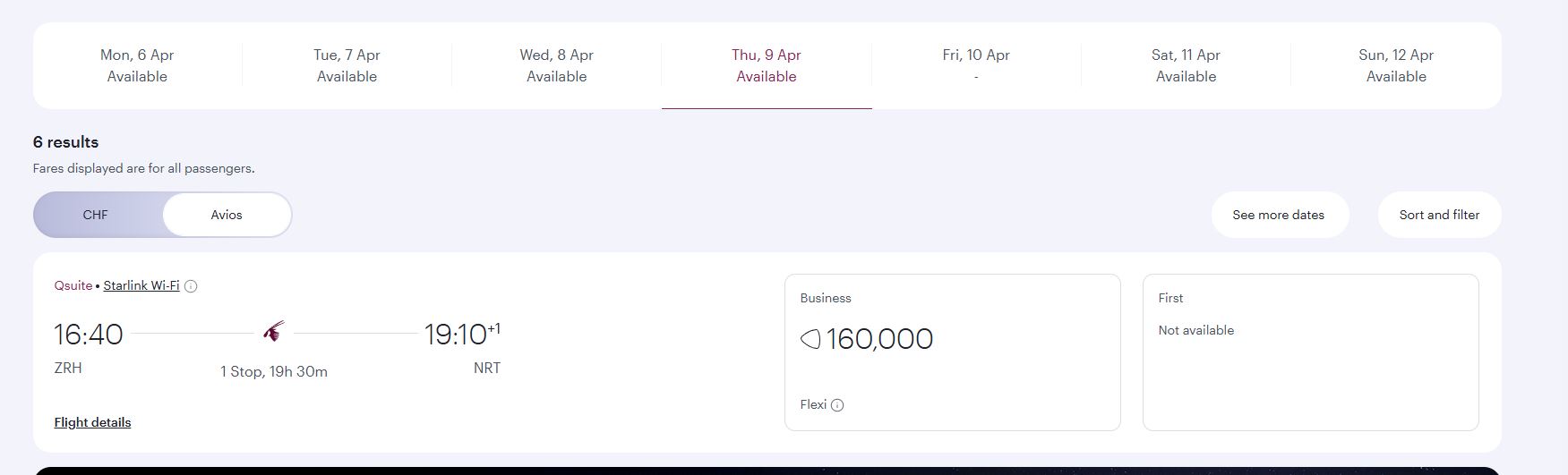 Also wenn ich meine Reise über den „Zum Deal“ Link via Doha eingebe, zeigt es mir einen Betrag von 15‘000chf an.. Muss ich mich da irgendwie einloggen damit ich den Betrag in Avios sehe und der günstiger wird?