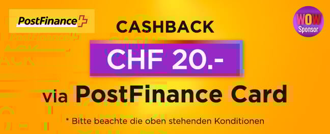 Bezahle während der WOW Week deine Bestellung mit POSTFINANCE Card oder Postfinance onlinezahlung und erhalte CHF 20.- auf dein POSTFINANCE-Konto zurückerstattet.