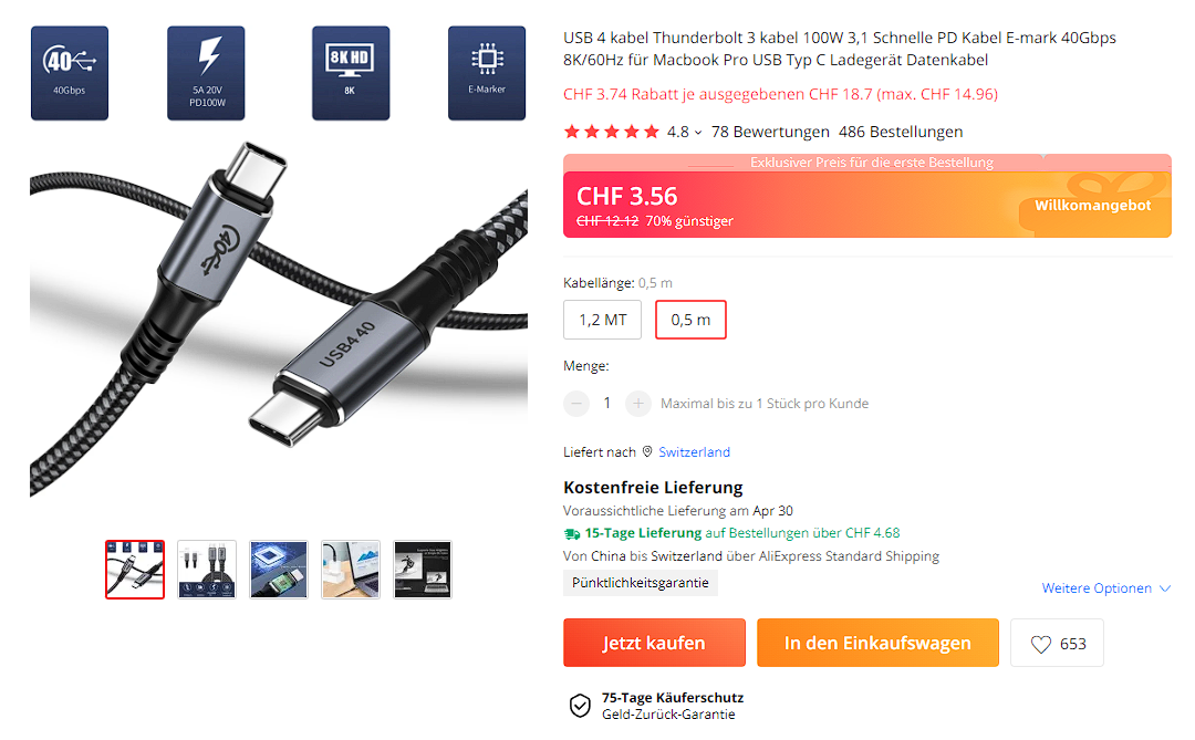 Ich meinte dieses Kabel auch bei Wish gesehen zu haben. Da gibt es ja den CHF 5.00 Gutschein bei der ersten Bestellung.
