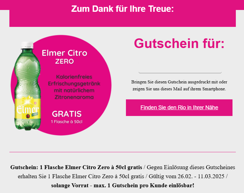 Bei Rio Getränke gibt es derzeit eine Gratis-Aktion, bei der ihr euch diesmal ein Getränk sichern könnt. Ihr erhaltet eine Flasche Elmer Citro Zero (50 cl) gratis. Einfach den Gutschein an der Kasse vorzeigen.