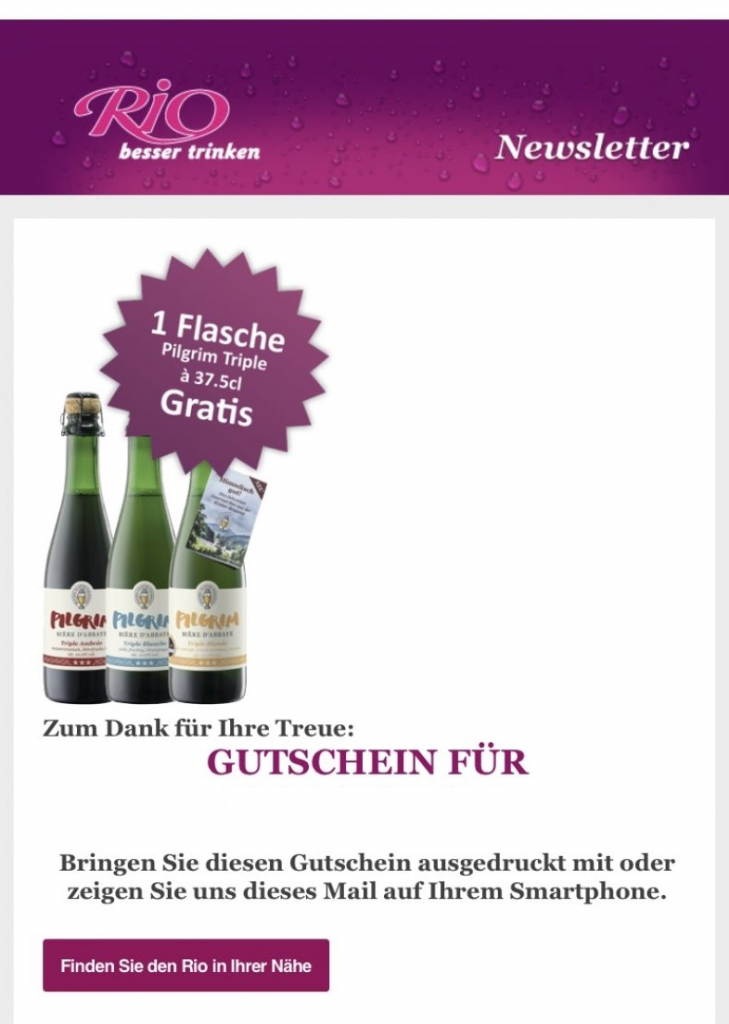 Im Newsletter von Rio Getränkenarkt gibt es ein Gutschein für 1 Flasche Pilgrim a 37.5cl gratis