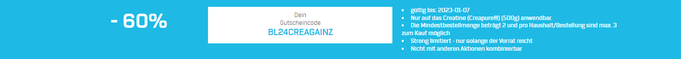 Ihr müsst 2 Stück (500gr)  in den Warenkorb legen und den Code: bl24creagainz eingeben. Maximal könnt ihr vom Creatin nur 3 (1.5kg) bestellen. Wenn ihr mehr hinzufügt, wird der Gutschein leider entfernt, auch nur 1x geht nicht.