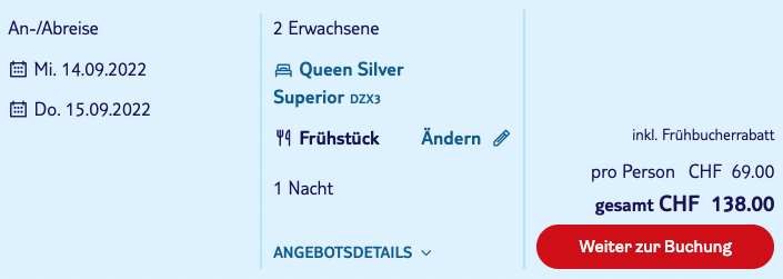 Wusstet ihr, dass das erste Hard Rock Hotel Europas 2017 in Davos eröffnet wurde? Im 4*-Superior-Hotel mit Alpenblick und schickem Spa übernachtet ihr zu zweit für CHF 138 inklusive Frühstück, wenn ihr bei Tui.ch bucht. Reisedaten zu diesem Preis können im August, September und Oktober gefunden werden. Ab November findet man Reisedaten für 5 Franken mehr pro Person.