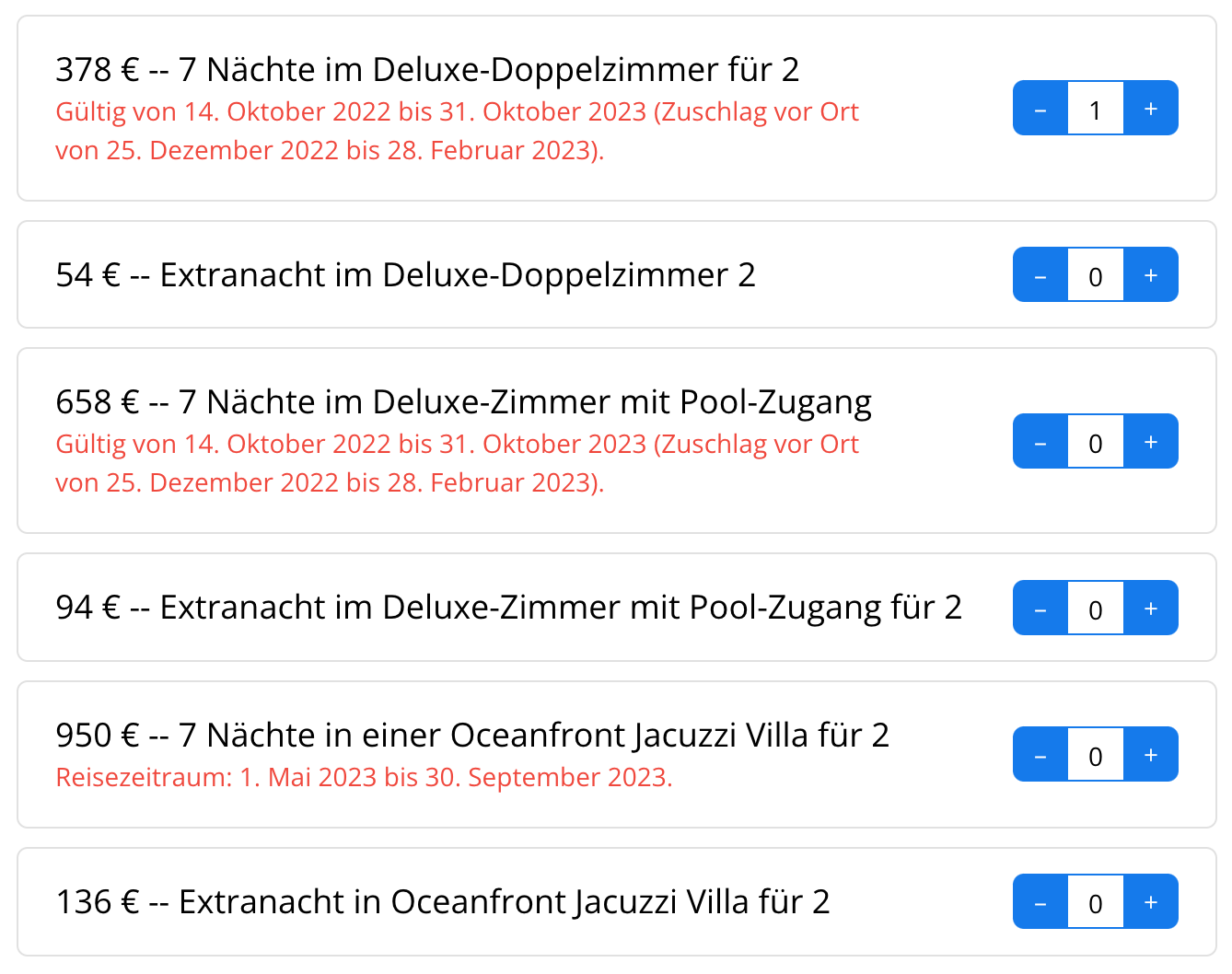Zwei Personen zahlen insgesamt 378€ (ca. 393 Franken) und erhalten folgende Leistungen: