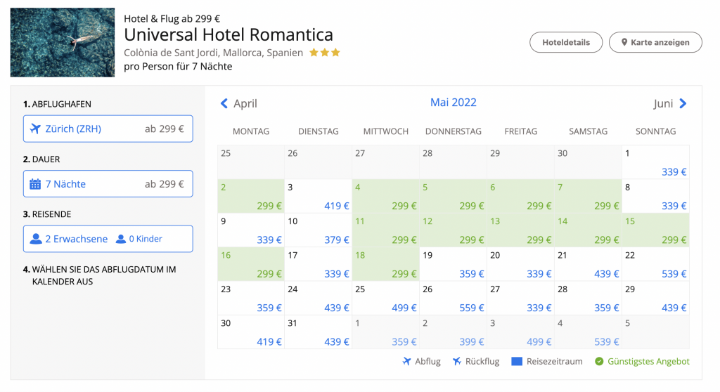 Bei Travelzoo gibt es derzeit ein attraktives Angebot für eine Woche im 3-Sterne Hotel Universal Romantica in Mallorca. Das Angebot ab 299€ (ca. CHF 308) pro Person gilt an einigen Daten im Mai und dann wieder im Oktober. Dazwischen steigen die Preise aufgrund der Hauptsaison.