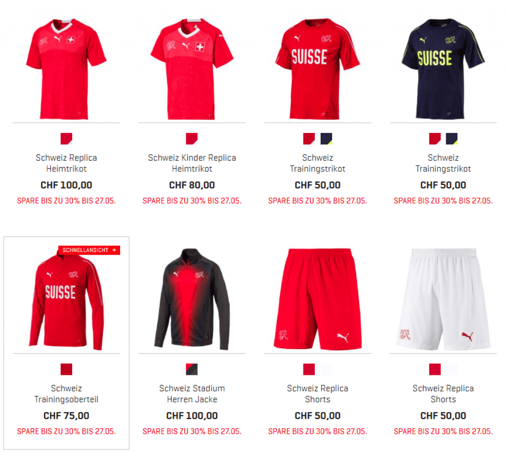 Nebst vielen Sneakers und Sportfashion-Artikeln gibt’s beispielsweise auch Fanartikel der Schweizer Nati mit dem Rabatt zu kaufen.