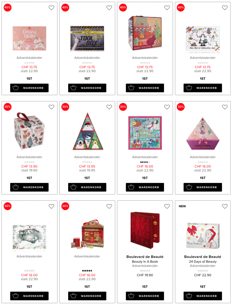 Wer noch ein Adventskalender sucht ist im Glück! Bei Import Parfumerie gibt es aktuell 30-40% auf 10 Adventskalender, um sich auf die Weihnachtszeit vorzubereiten und jeden Tag eine Überraschung zu erleben. Es gibt für fast jede/n einen passenden Kalender, denn die Auswahl ist gross mit Beauty-, Herrenpflege-, Badeartikel-, Kerzen,- Kinderadventskalender und vielen mehr.