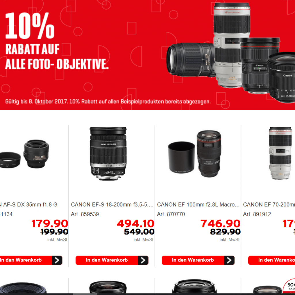 Interdiscount hat für dich alle Foto-Objektive um 10% reduziert. Einen Gutscheincode oder Ähnliches brauchst du nicht, um von den günstigen Preisen zu profitieren. Die Preise sind schon reduziert angegeben. Die Aktion läuft noch bis einschliesslich Sonntag, den 8. Oktober.