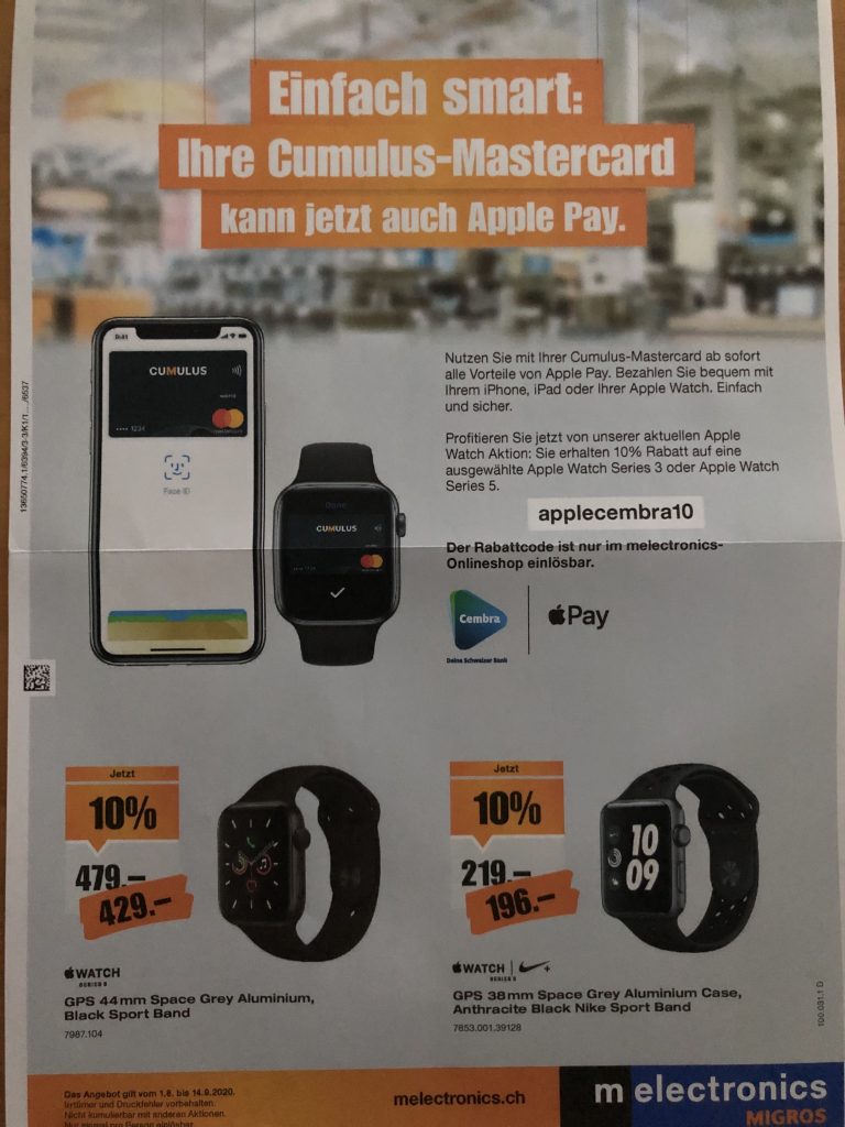 Im Rahmen Cembra bietet melectronics aktuell 10% auf ausgewählte Apple Watch Series 3 und 5 an.
