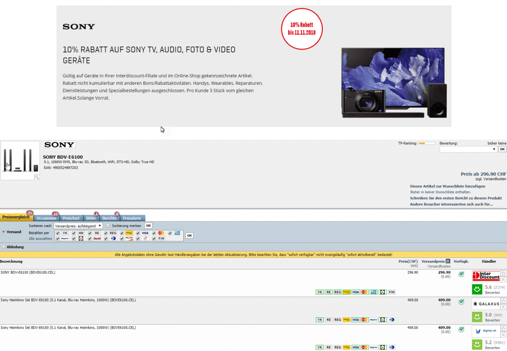 Hey Leute habe gerade entdeckt das Interdiscount im Moment einen Rabatt von 10% auf viele Sony TV, Audio, Foto und Video Geräte. Teilweise bieten die Kameras sogar noch einen Cashback bis zu CHF 200.-. Habe mir gerade ein neues Sony Heimkino Set für CHF 296.- gegönnt statt für CHF 409.- bei der Konkurrenz! Die Aktion gilt bis 11.11.2018.