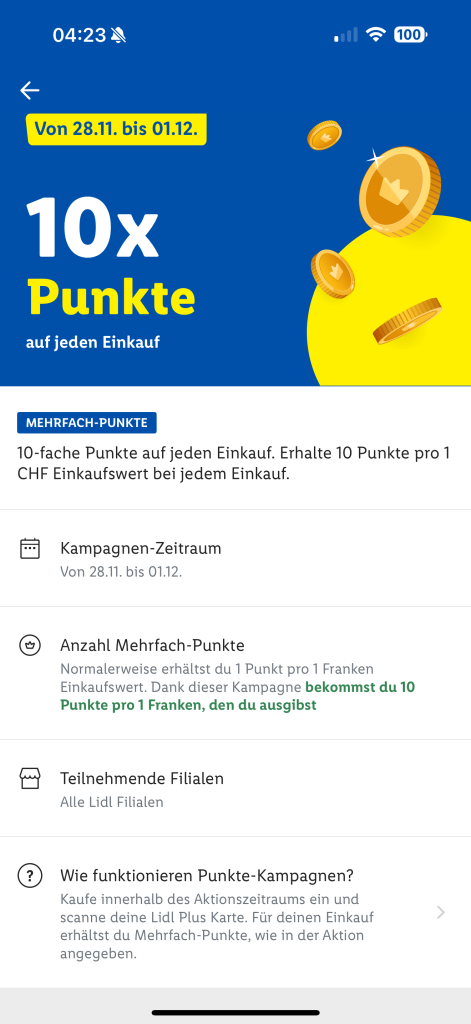 Für Lidl Plus Kunden gibt es ab Donnerstag 28.12-1.12 das 10 Fache an Lidl Punkte mit dem man den Einkauf zum Beispiel reduzieren kann oder Produkte gratis erhält ,sobald man genügend Punkte gesammelt hat.