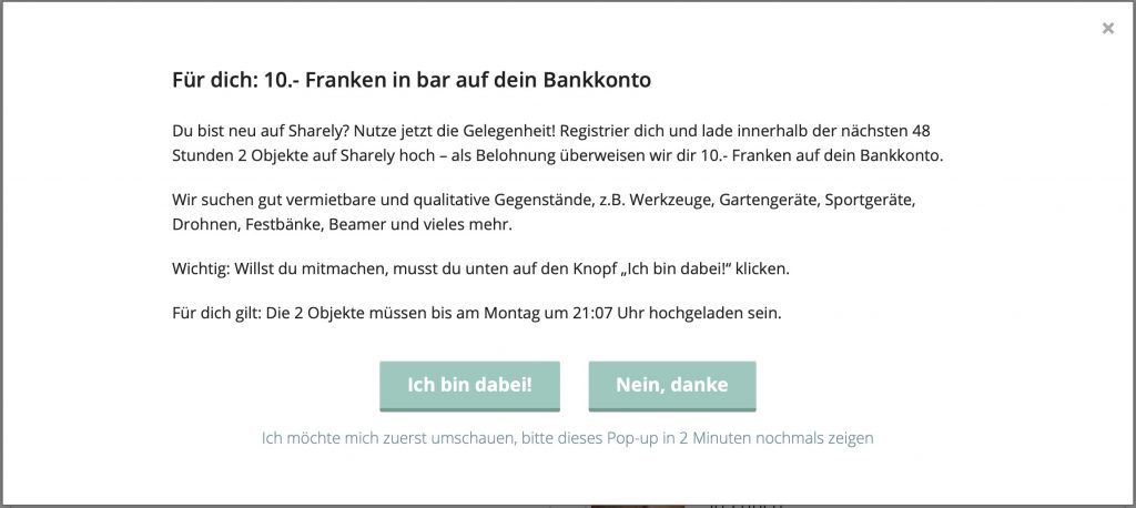Derzeit läuft eine Promotion bei SHARELY. Das Angebot erscheint nach einiger Zeit mehr oder minder zufällig als überlagerndes Fenster (siehe unten) auf der Webseite von Sharely, soweit man noch nicht Kunde ist. Verlinken oder anderweitig erzwingen kann man es leider nicht. Ggf. hilft es, entsprechende Cookies der Site zu löschen. Nach Anmeldung und Hochladen von zwei Objekten zum Vermieten erhält man 10 Franken aufs Konto. Klappte bei mir!