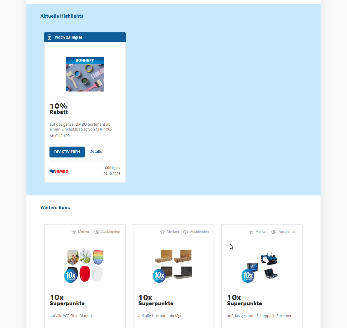 Wer aktuell bei JUMBO einkaufen möchte, kann mit dem neuen Bon in der Supercard-App 10 % Rabatt auf das gesamte Sortiment erhalten – gültig ab einem Einkaufswert von CHF 100.–. Der Rabatt lässt sich sowohl in den JUMBO-Verkaufsstellen als auch online auf jumbo.ch einlösen. Wichtig: An der Kasse muss die Supercard vorgewiesen oder online mit der Supercard-ID eingekauft werden.