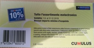 Es gibt wieder einen melectronics Gutscheincode/Bon. Man kann ihn Online oder aber auch ausgedruckt in der Filiale einlösen. Dies bis zum 31.12.2018, leider nur einmalig pro Cumuluskarte.