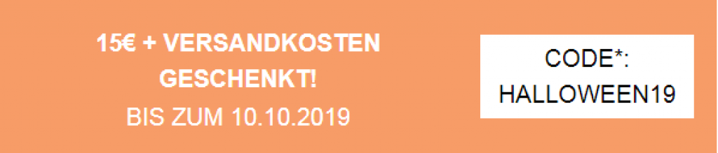 Mit dem Gutscheincode HALLOWEEN19 spart man CHF 15.- bei der nächsten Bestellung und der Versand ist kostenlos. Diese Aktion gilt bis zum 10.10.2019.