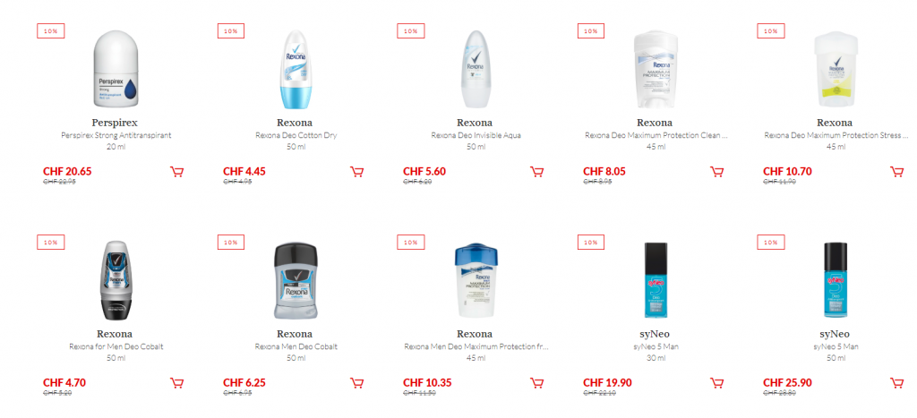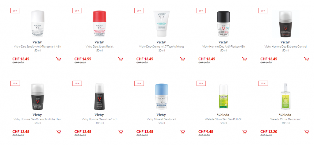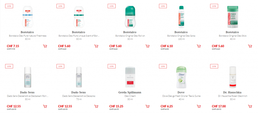 Bei Zur Rose gibt’s derzeit 10% Rabatt auf alle Deos. Der Rabatt wird automatisch im Shop abgezogen. Zusätzlich erhält man mit dem Coupon Code ROSE123 gratis Lieferung. So kann man auch nur ein einziges Deo bestellen, wenn man möchte.