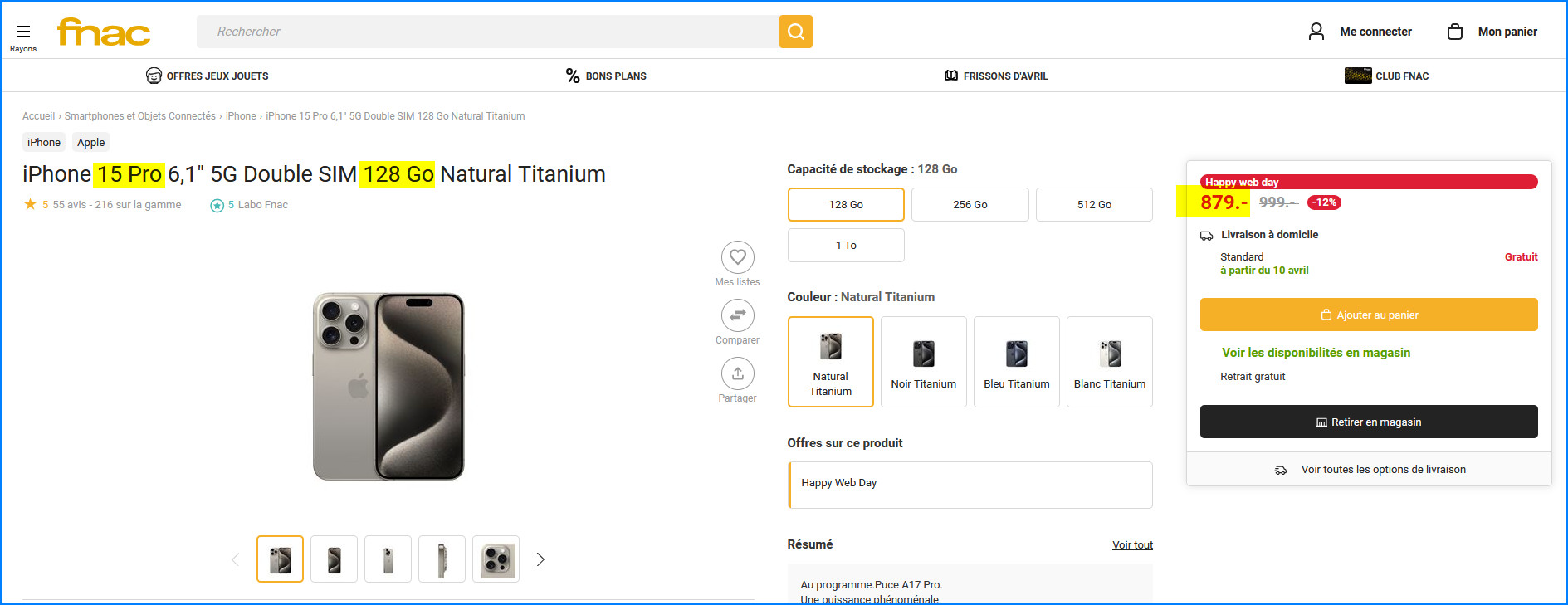 Pour le 15 Pro 128 Go, 20 Frs de moins chez Fnac (879 Frs) (lien)