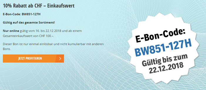 Vom 16. bis 22.12.2018 gibt es im Onlineshop von Coop Bau & Hobby ab einem Einkaufswert von CHF 100.- mit dem Code BW851-127H 10% Rabatt.