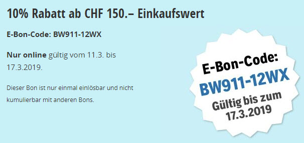 Update - 2019.03.12Vielen Dank an @lanciay für den neuen Code ab MBW CHF 100.-!
