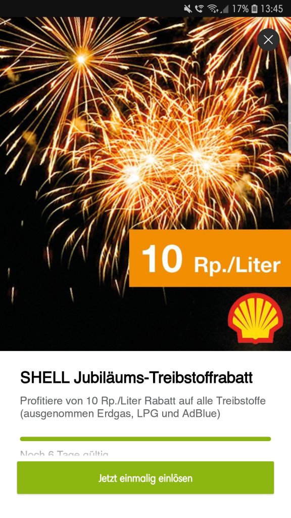 In der Migrolino App gibts wieder 10 Rappen Rabatt auf Treibstoffe bei SHELL (mit integr. Migrolinoshop) (ausgn. Erdgas / LGP und AdBlue)