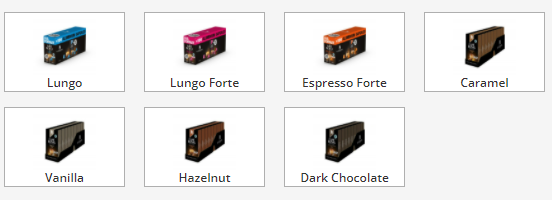 Zur Auswahl stehen Lungo, Lungo Forte, Espresso Forte, Caramel, Vanilla, Dark Chocolate und Hazelnut.