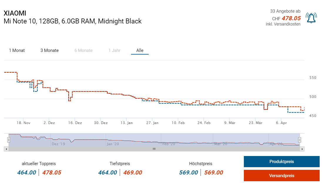 Bei Amazon.de gibts ein weiteres mit Features vollgepacktes Smartphone zum neuen Bestpreis von 380 Franken. Dieses Mal ists das Kameramonster von Xiaomi, das Mi Note 10 in der 6/128GB-Ausführung und in allen Farben. Derzeit beträgt der zweitbeste Preis dafür stolze 480 Franken, der Tiefstpreis lag bei CHF 469.-