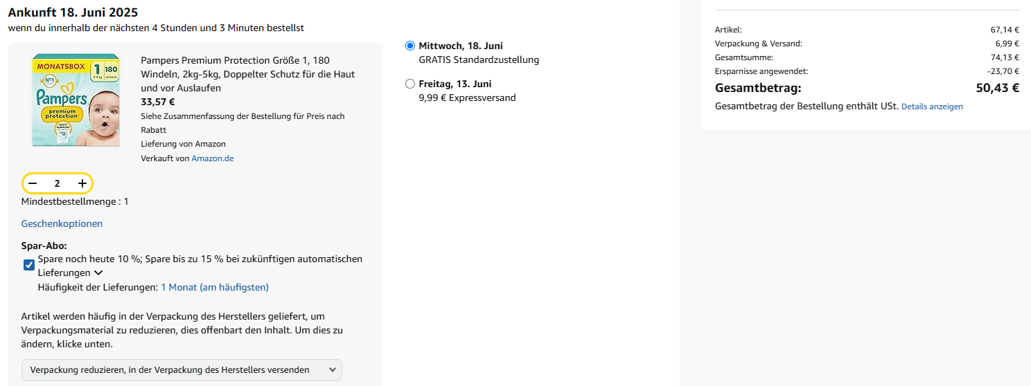 2. Ihr füllt euren Warenkorb zusätzlich mit Artikeln, welche dann für Gratis Versand qualifizieren (>49€). Die Versandkosten durch die Pampers Box zum Beispiel, reduzieren sich dann in einer Mischrechnung auf etwa 3€. Wie diese Rechnung genau zu Stande kommt habe ich noch nicht rausgefunden, aber 3€ ist immerhin besser als 6,99€.