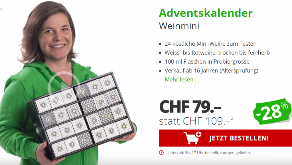Jetzt von 9-10 Uhr gibt es den Weinmini Adventskalender für CHF 79.-. Den zweitbesten Preis findet man bei Galaxus mit CHF 109.-.