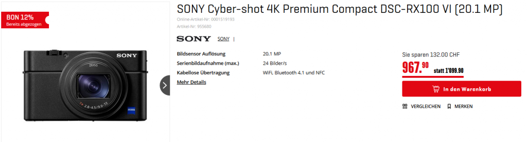 Aktuell 12% auf Kameras, Video, Audio und TV- Geräte von Sony auf Interdiscount Die RX100 VI aktuell zum Bestprice ever: 967.90- CHF - toppreis aktuell: 1049.90-