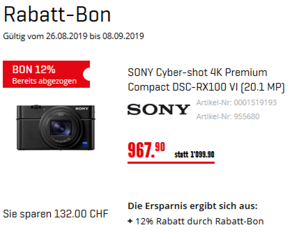 Die RX100 VI aktuell zum Bestprice ever: 967.90- CHF -