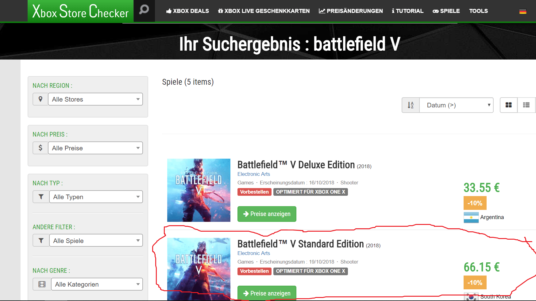 Zunächst müsst ihr euch jedoch für ein bestimmtes Land entscheiden, dazu hilft euch diese Website, die die günstigsten Länder anzeigt, in welchen die Angebote zu haben sind. Einfach beispielweise Battlefield V eingeben: