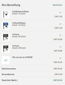 Bis am 11.5. könnt ihr euch zum Muttertag 15 % Rabatt ab einem Mindestbestellwert von CHF 50.– sichern. Zusätzlich bekommt ihr mit dem Rabattcode eine Gratis-Degustationsbox bei Delizio. Das Angebot gilt nur solange der Vorrat reicht auf ausgewählte Kaffeekapseln. Hierzu habe ich ein Beispiel herausgesucht, das eventuell interessant sein könnte.