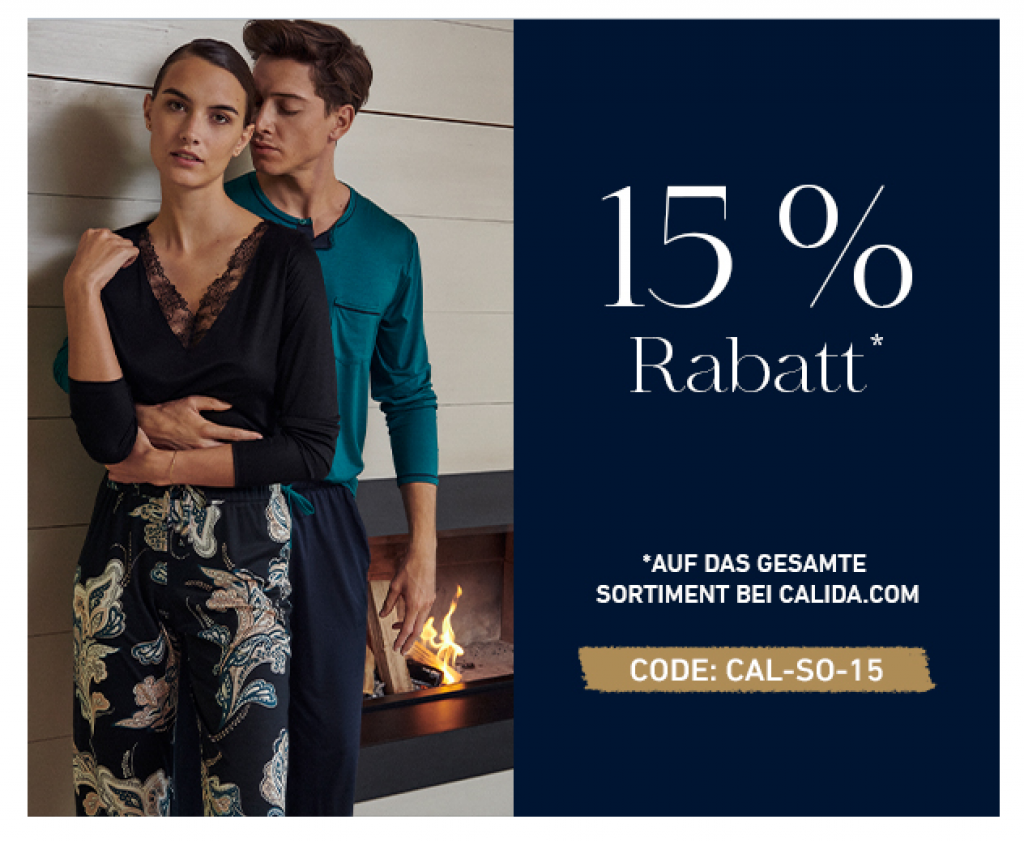 *Gültig bis 31.01.2022 auf das gesamte Sortiment bei www.calida.com ab einem Mindestbestellwert von 49 Franken. Nur online einlösbar. Nur einmal pro Person und Bestellung einlösbar, nicht mit anderen Rabattaktionen oder Gutscheinen kombinierbar. Bereits reduzierte Artikel sind ausgeschlossen. Keine Barauszahlung oder nachträgliche Anrechnung.