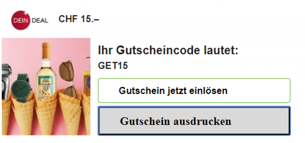 Bei DeinDeal gibt’s mit dem Gutscheincode GET15 einen Rabatt von 15 Franken auf die erste Bestellung, wenn man für mindestens CHF 50.- bestellt. Der Gutscheincode gilt nur für Neukunden, aber ein neues Konto ist ja schnell erstellt.