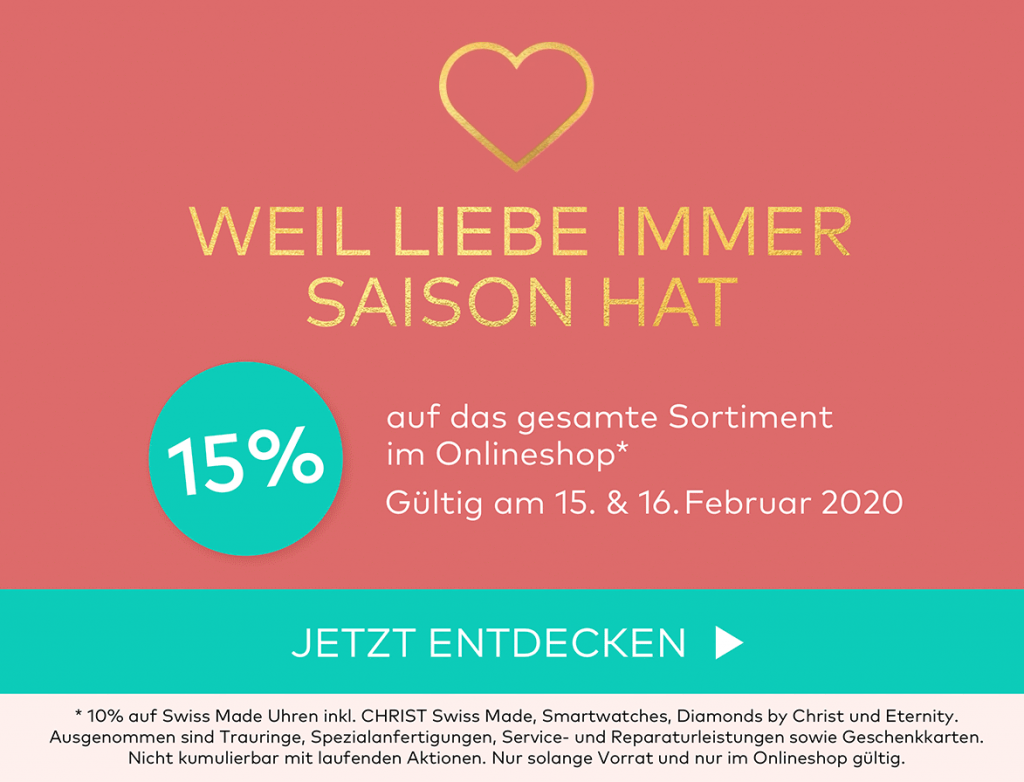 Nur 10% gibt’s auf Swiss Made Uhren, Smartwatches sowie Diamonds by Christ und Eternity. Ganz ausgeschlossen sind Trauringe, Spezialanfertigungen, Service- und Reparaturleistungen sowie Geschenkkarten.