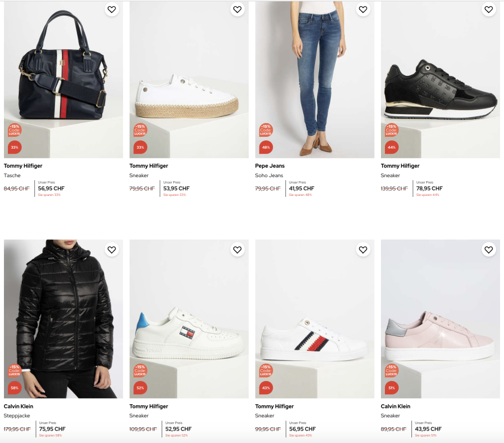 Heute gibt es bei Dress-for-less 15% Rabatt auf alles mit dem Code “LUCK15” sowie kostenlosen Versand ab CHF 59.- Bestellwert (darunter 4 Franken). Dress-for-less hat viele attraktive Markenangebote für Damen, Herren und Kinder. Zu beachten ist der Mindestbestellwert von 44 Franken.