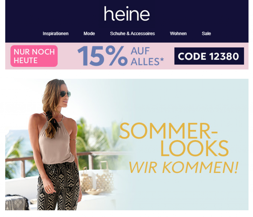 Bei Heine gibt es nur noch heute 15 % auf das gesamte Sortiment.