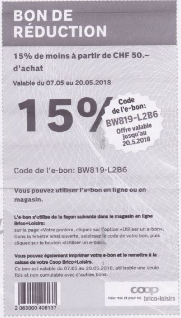 Bei Coop bau+hobby kriegt man bis am 20. Mai ab 50.- MBW (Mindestbestellwert) 15% Rabatt mit dem Code BW819-L2B6.
