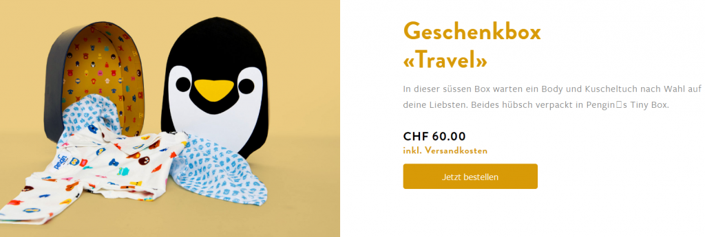 Bei Pengin.ch gibt es momentan 15% auf Geschenkboxen. Die Aktion ist bis zum 15.12. gültig und man muss diesen Code verwenden: i<3pengin Pengin stellt Baby-Klamotten her und die Produkte sehen sehr hochwertig aus. Danke an Daniel für den Tipp:)