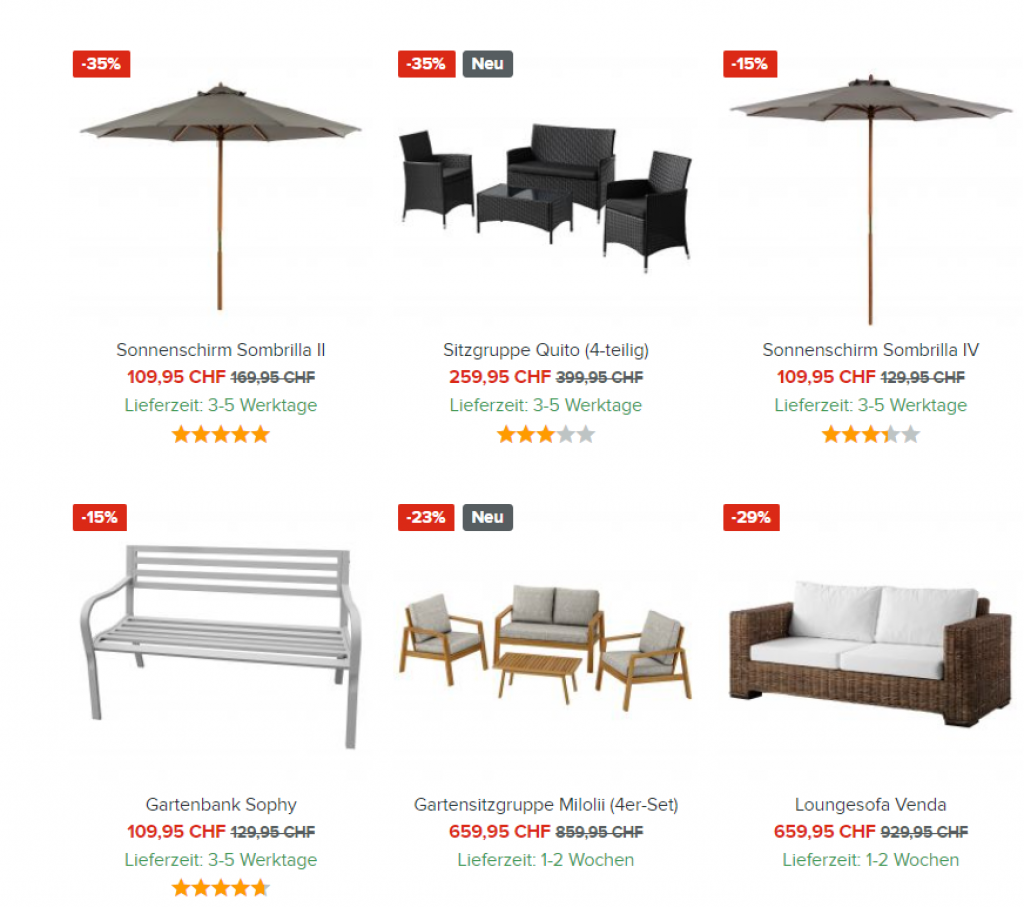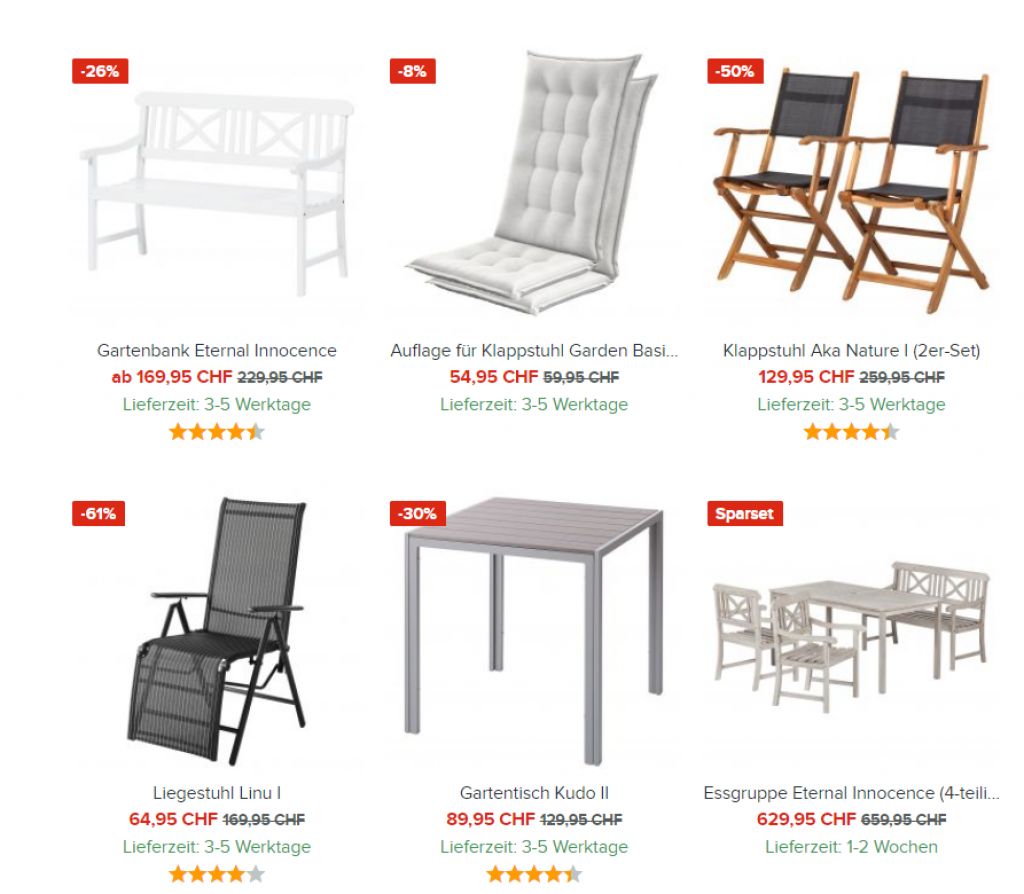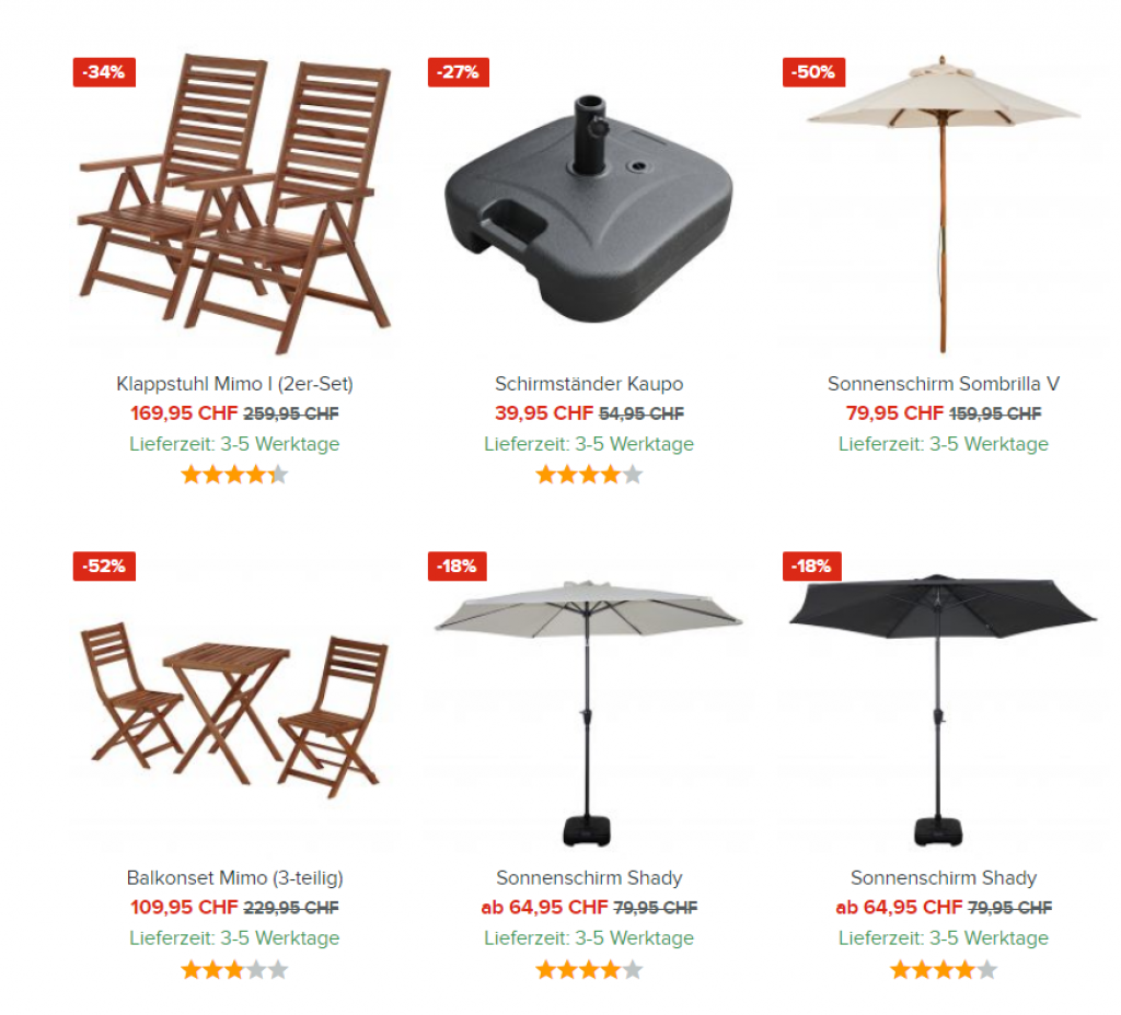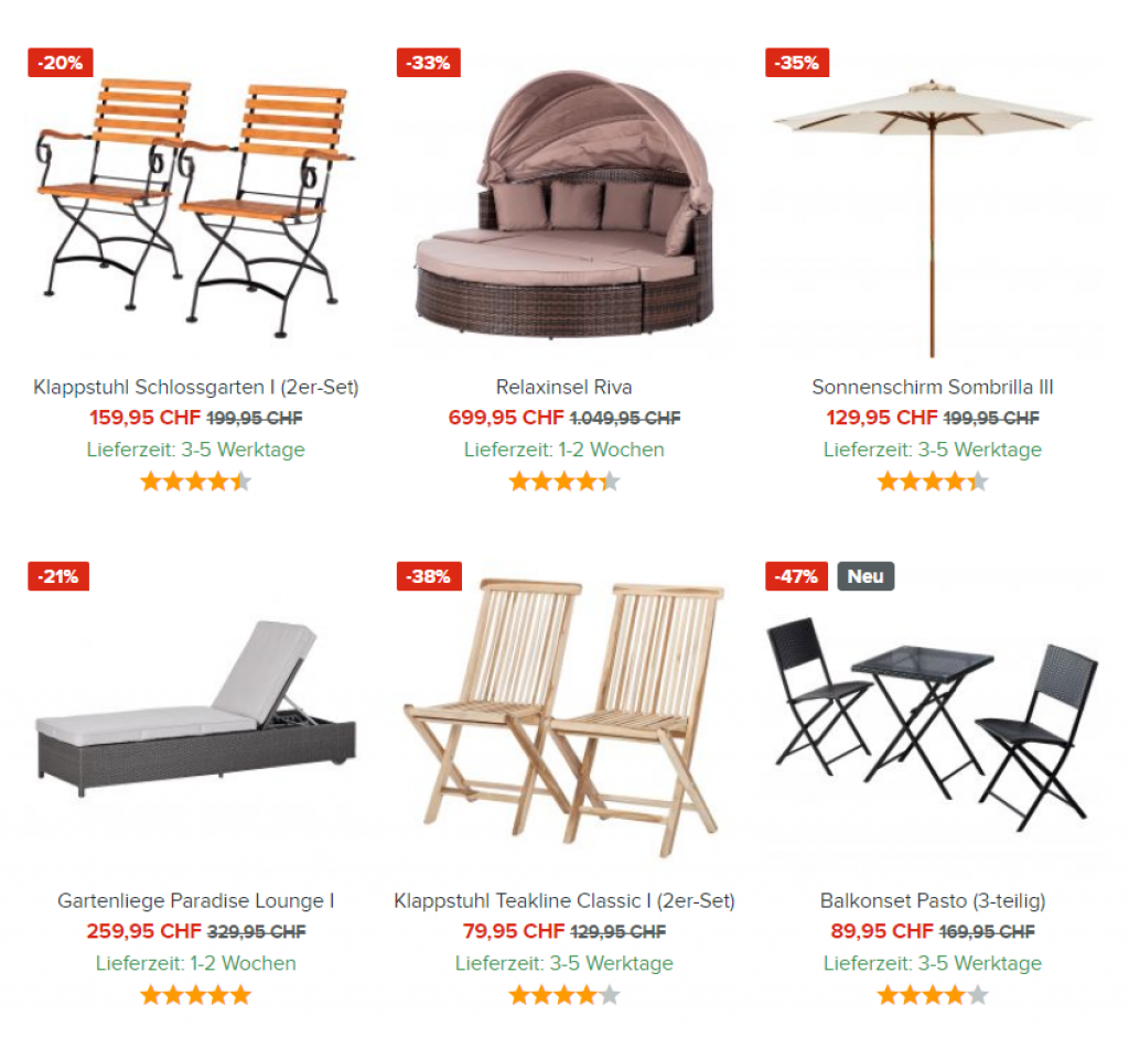 Bei home24 gibt’s mit dem Gutscheincode GARTENSALE15-CH 15% zusätzlichen Rabatt auf alle reduzierten Artikel im Garten-SALE. Die Lieferung bei home24 ist immer gratis. Damit lassen sich einige gute Deals erzielen: