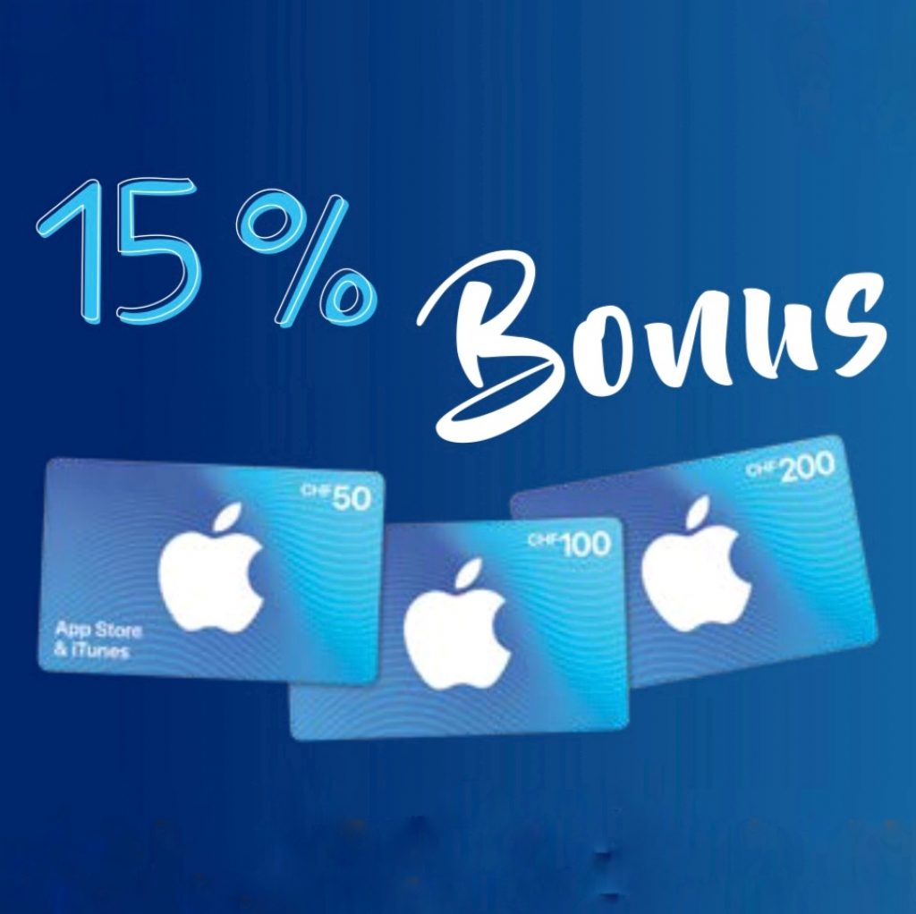 Bei einem Kauf einer iTunes Geschenkkarte (CHF 50 / CHF 100 / CHF 200) erhalten Sie zusätzlich 15% Bonus dazu.
