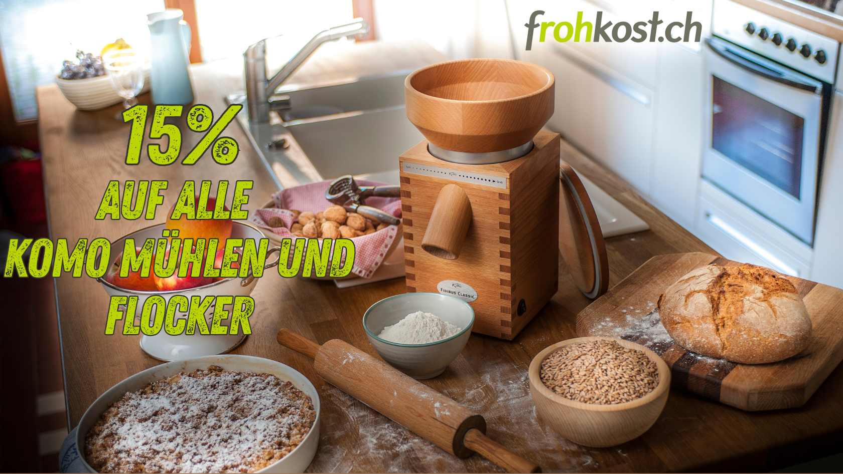 Black Friday bei frohkost.ch: 15% Rabatt auf alle KoMo Getreidemühlen, Flocker & Zubehör. Nur vom 30.11 bis 01.12.25!