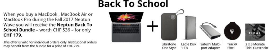 Zusätzlich kann ein Back to School Bundle für 179 anstatt 536 CHF erworben werden. Dabei ist eine LaCie 1TB Disk, ein Satechi Multiport Adapter ein TrackR Pixel und ein Libratone One Style + 2*3 Monate Tidal Gutschein enthalten.