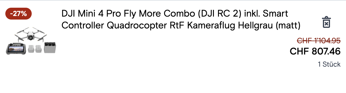 Oder die DJI Mini 4 Pro Fly More Combo (DJI RC 2) inkl. Smart Controller zum Bestpreis von 807.45 Franken.
