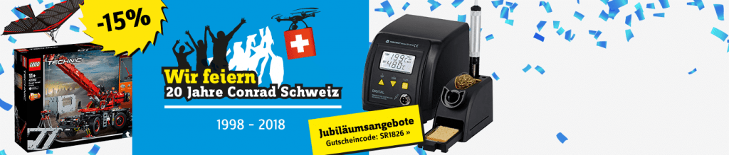 Bei Conrad erhält man gerade 15% Rabatt auf alle Spielwaren und Toolcraft Lötstationen, wenn man den Gutscheincode SR1826 verwendet. Die Aktion läuft noch bis und mit 26. Dezember.